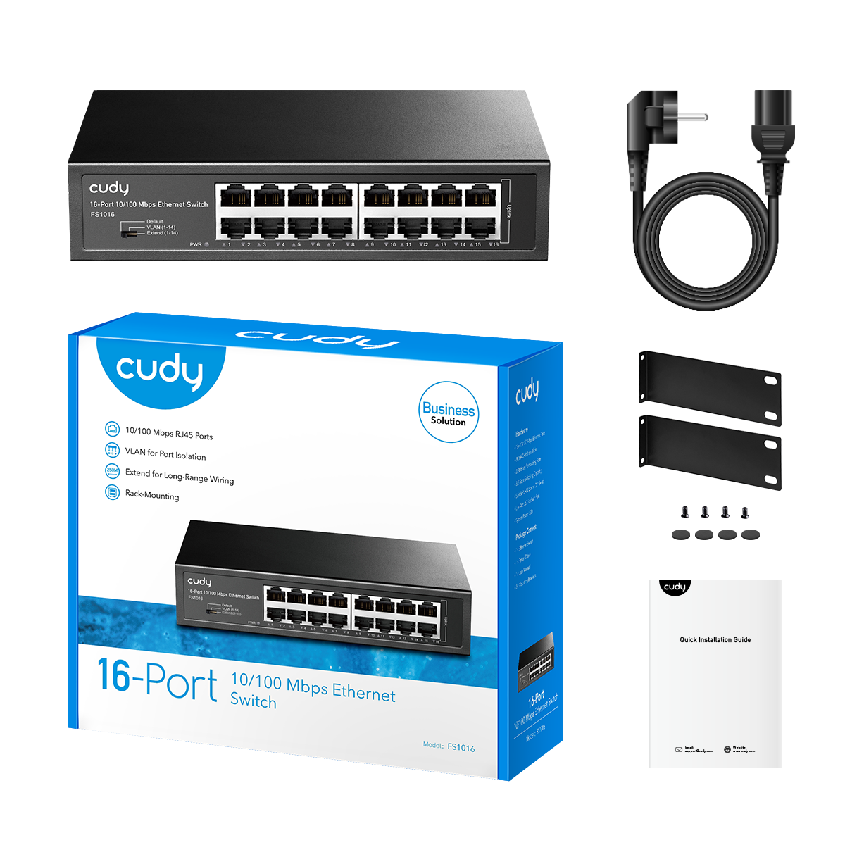 Bộ chuyển mạch 16-FE với vỏ kim loại, lý tưởng cho việc mở rộng mạng có dây trong môi trường gia đình và văn phòng.