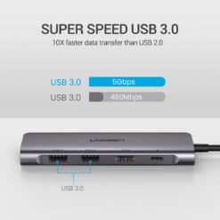 – Truyền dữ liệu siêu tốc 5Gbps : Đồng bộ hóa các tệp trực tiếp giữa các thiết bị lưu trữ, như ổ cứng và thẻ SD. Hub USB Type C này bổ sung thêm 2 cổng USB 3.0 để kết nối các thiết bị ngoại vi USB như ổ flash, ổ cứng, bàn phím, chuột, máy nghe nhạc MP3, v.v với tốc độ tối đa 5Gbps, truyền video HD trong vài giây.