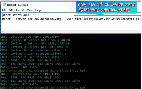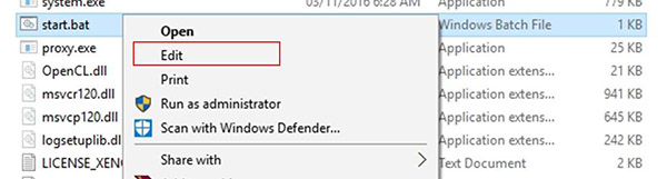 Sau khi tải về, bạn cần giải nén, vào thư mục vừa giải nén được Click chuột phải vào file “start.bat” chọn”edit” và sửa lại địa chỉ ví Wallet lấy từ trang poloniex.