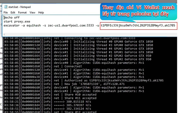 Sau khi tải về, giải nén và vào thư mục vừa giải nén được Click chuột phải vào file “start.bat” chọn “edit” và sửa lại địa chỉ ví Wallet lấy từ trang poloniex.