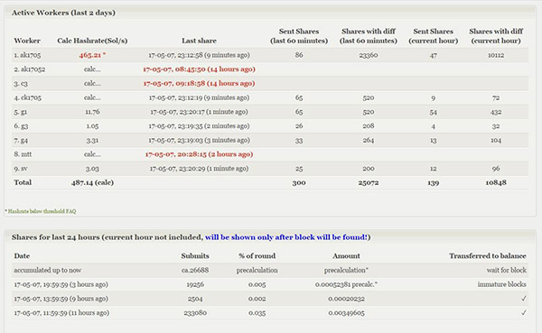 * Kéo xuống gần dưới cùng mục Active Worker last 2 day: là danh sách các máy đào của bạn chạy trong 2 ngày gần đây, máy đào màu đỏ là ngừng hoạt động trên 30 phút, tốc độ của từng máy …vv